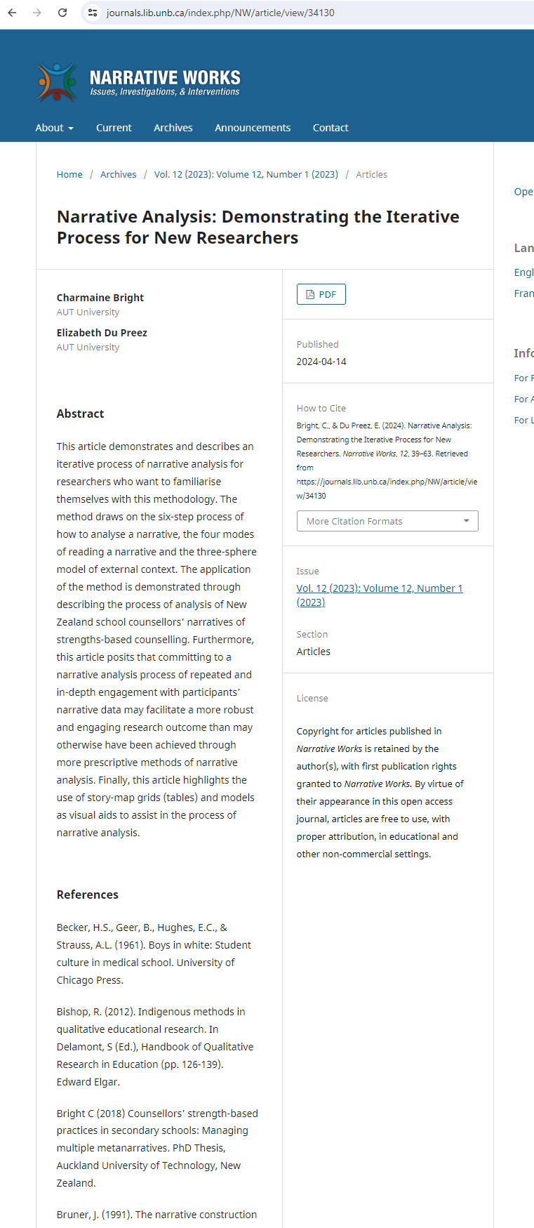 | dc.description.abstract | This article demonstrates and describes an iterative process of narrative analysis for researchers who want to familiarise themselves with this methodology. The method draws on the six-step process of how to analyse a narrative, the four modes of reading a narrative and the three-sphere model of external context. The application of the method is demonstrated through describing the process of analysis of New Zealand school counsellors’ narratives of strengths-based counselling. Furthermore, this article posits that committing to a narrative analysis process of repeated and in-depth engagement with participants’ narrative data may facilitate a more robust and engaging research outcome than may otherwise have been achieved through more prescriptive methods of narrative analysis. Finally, this article highlights the use of story-map grids (tables) and models as visual aids to assist in the process of narrative analysis. | |